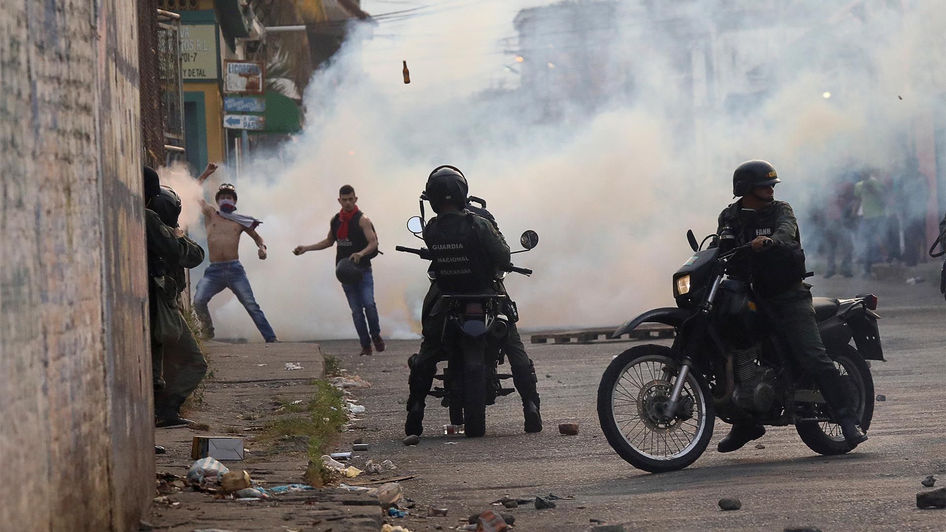 Efectivos de las Fuerzas Armadas de Venezuela y miembros de colectivos chavistas atacaron con gases lacrimógenos y perdigones a las personas que se encontraban esperando la llegada de los camiones con ayuda humanitaria en el puente Simón Bolívar y Santander -que comunican a los ciudades de San Antonio y Ureña (Venezuela) y Cúcuta (Colombia).
