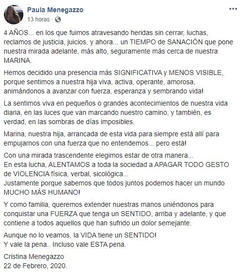 El hermano de Marina dijo que fue "un desgaste importante seguir con la causa, especialmente por la distancia" y afirmó que "nunca se podrá estar conforme con nada de lo que se resuelva después de un hecho así".