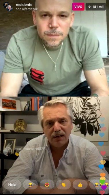 Este lunes por la tarde, el artista puertorriqueño René Perez (cantante de Calle 13), realizó una transmisión en vivo de Instagram junto al presidente Alberto Fernández, quien respondió a las respuestas que el cantante le hizo y se mostró satisfecho con las medidas tomadas para contener la pandemia del coronavirus. La transmisión fue vista por 198.000 personas.