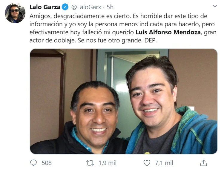 “Es horrible dar este tipo de información y yo soy la persona menos indicada para hacerlo, pero efectivamente hoy falleció mi querido Luis Alfonso Mendoza, gran actor de doblaje. Se nos fue otro grande. Descansa en paz”, informó en Twitter.