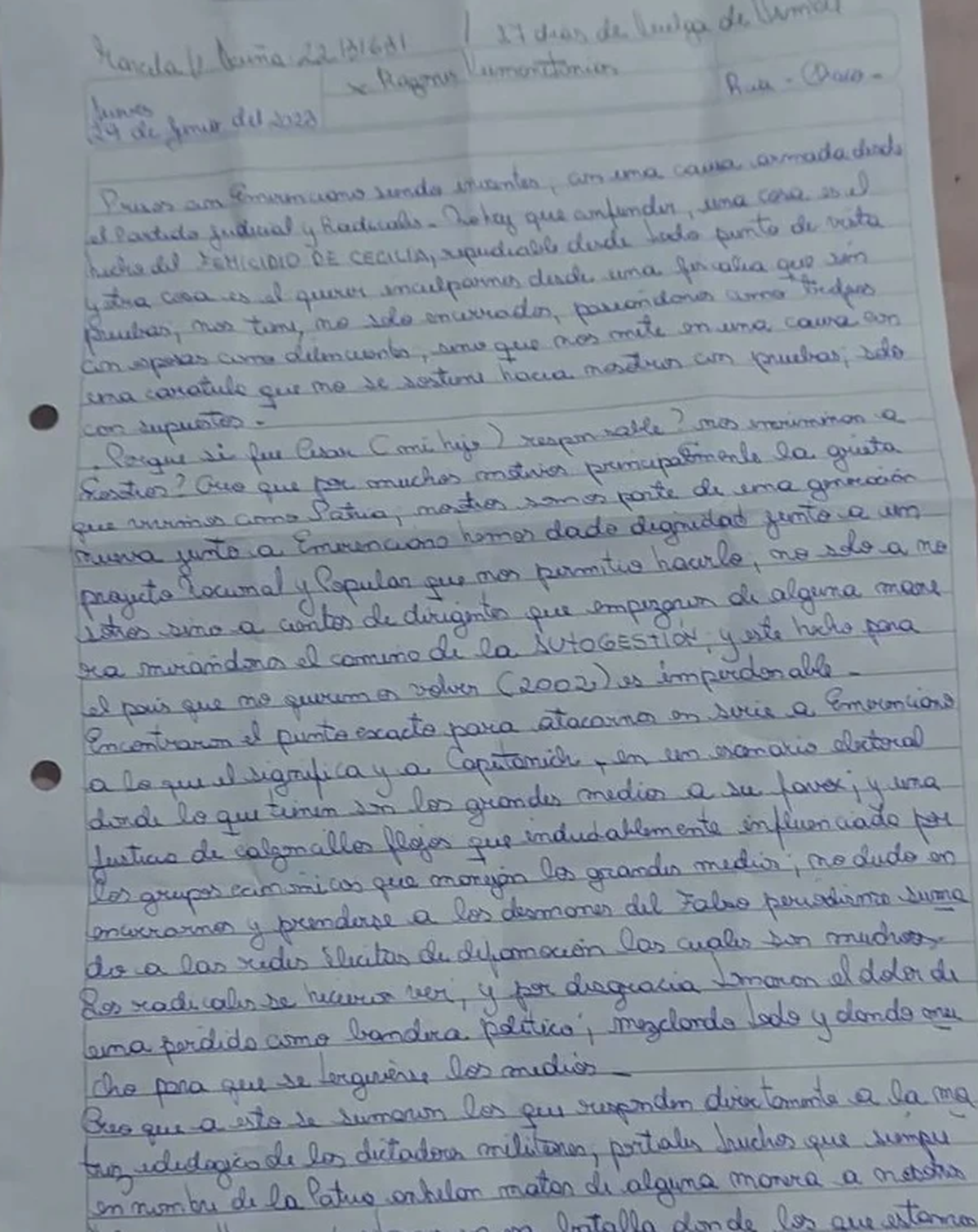 "Presos con Emerenciano siendo inocentes, con una causa armada desde el partido judicial y radicales. No hay que confundir, una cosa es el hecho del femicidio de Cecilia, repudiable desde todo punto de vista, y otra cosa es el querer inculparnos desde una fiscalía que, sin pruebas, nos tiene no solo encerrados, paseándonos como trofeos con esposas como delincuentes, sino que nos mete en una causa con una carátula que no se sostiene hacia nosotros con pruebas, solo con supuestos", manifestó.