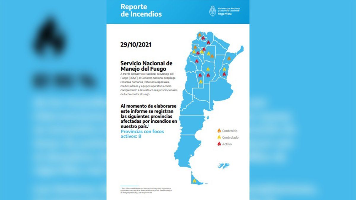 Según el informe diario que difundió hoy el SNMF, organismo que depende del Ministerio de Ambiente y Desarrollo Sostenible, las provincias de San Luis, Córdoba, Jujuy, Catamarca, Salta, Entre Ríos, Tucumán y La Rioja registraban focos activos de incendios, siendo las últimas dos las más afectadas.