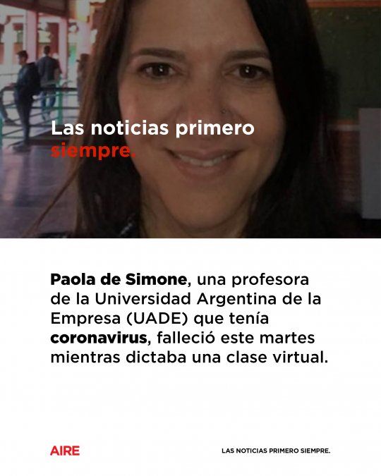 Paola de Simone, una profesora de la Universidad Argentina de la Empresa (UADE) que tenía coronavirus, falleció este martes mientras dictaba una clase virtual. La situación quedó registrada en un video que fue publicado por un estudiante en redes sociales, aunque luego fue eliminado a pedido de los familiares y otros alumnos.