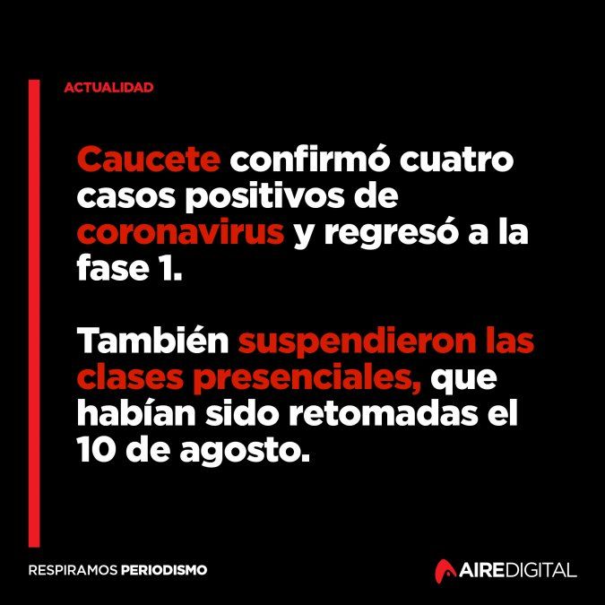 Además del regreso a fase 1 en Caucete, el Ejecutivo provincial dispuso también el estado de alerta de manera preventiva en el departamento 25 de Mayo, cercano a Caucete, y suspendió las clases presenciales en ambas localidades, al igual que en 9 de Julio y San Martín, todas ubicados al este de la capital de San Juan.