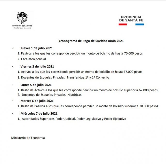 Este martes el gobierno provincial dio a conocer el cronograma de pago de los sueldos de junio de este año de los empleados públicos de Santa Fe. Comienza el jueves 1 de julio y se extiende hasta el miércoles 7.