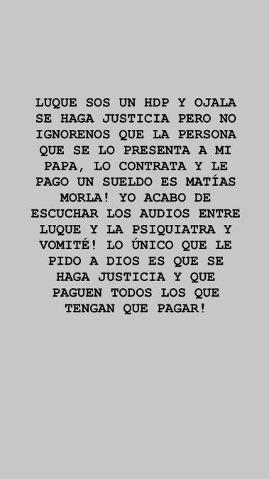 Sobre ese mensaje, Dalma Maradona escribió este domingo: “¿Y ahora de qué te vas a disfrazar? Vos y todos los que lo defienden…”. Y luego, aseguró: “Si la verdad siempre triunfa ustedes dos van presos”.