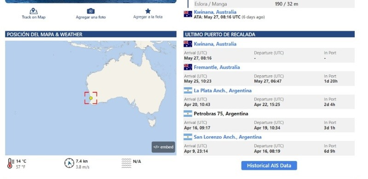 Fuentes aduaneras indicaron a Télam que el buque había pasado por Montevideo antes de San Lorenzo y luego tocó el kilómetro 171 de la Zona Común, próxima a La Plata; y que estaba cargado con soja en el área de bodega.