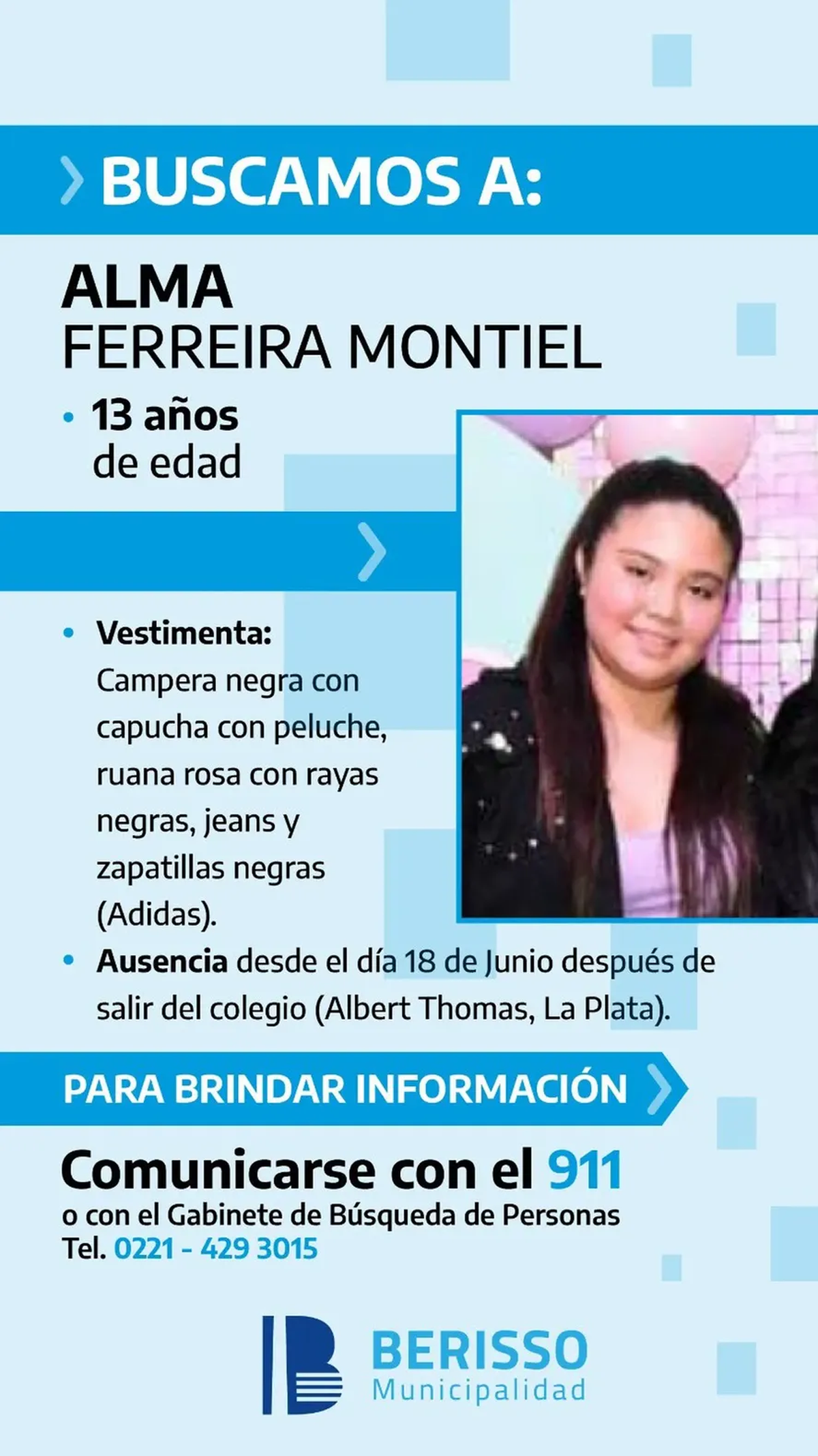 Alma, de 13 años, desapareció en la ciudad de Berisso, en la provincia de Buenos Aires, tras irse su hogar luego de haber discutido con su madre.