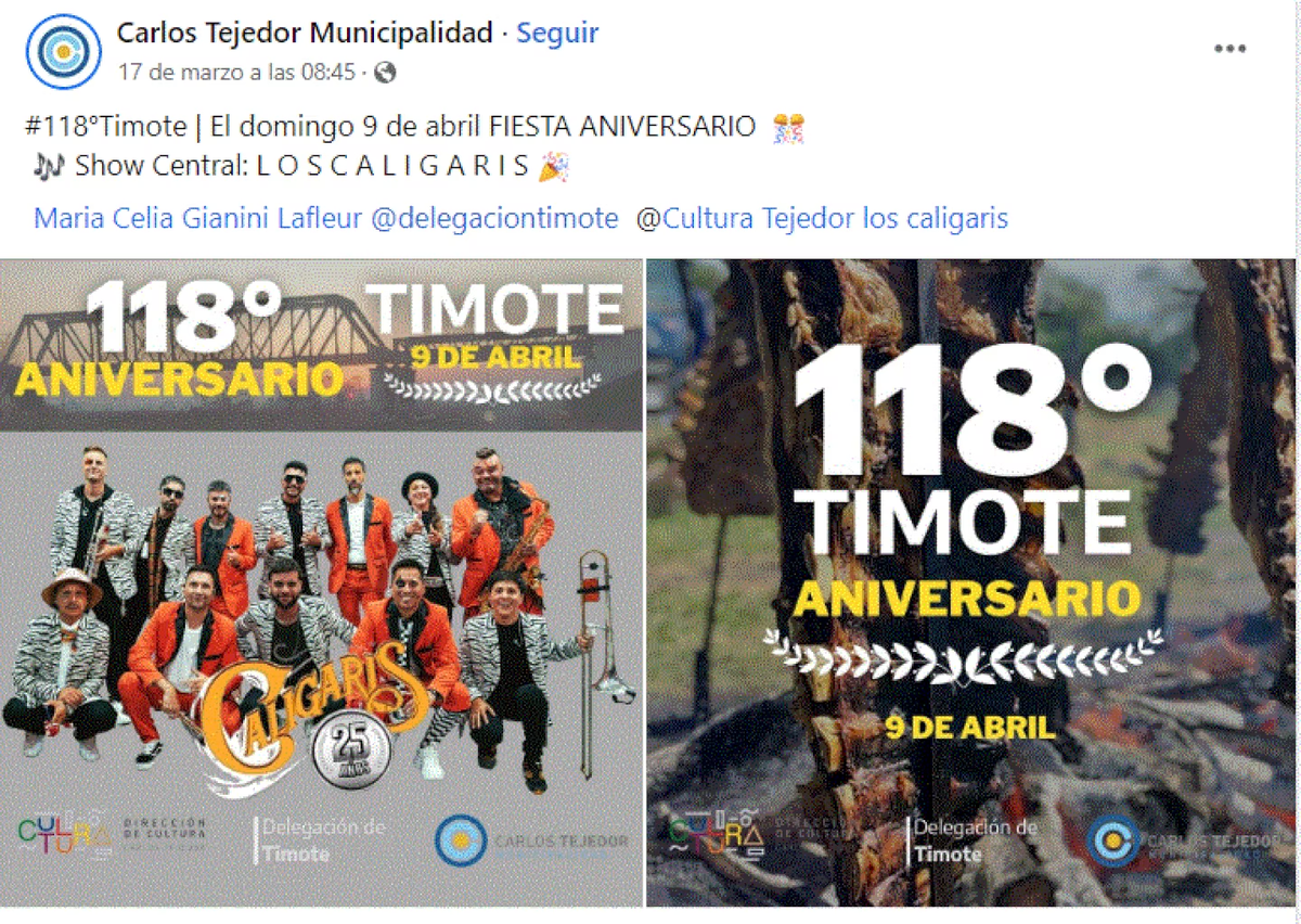 “#118°Timote | El domingo 9 de abril FIESTA ANIVERSARIO. Show Central: L O S C A L I G A R I S”, escribieron en un posteo en las redes sociales, junto a dos afiches, uno en el que se ve a la banda y en otro, un asado en plena cocción, dando a entender que habrá comida para disfrutar del día festivo.