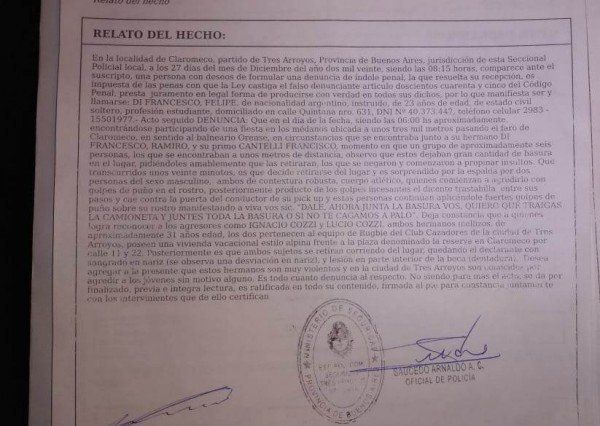 Según informaron fuentes policiales todo ocurrió en una playa de Claromecó, en la localidad de Tres Arroyos. Allí la víctima, identificada como Felipe Di Francesco de 23 años, acusa haber sido golpeado salvajemente por Lucio Cozzi e Ignacio Cozzi, dos hermanos mellizos que visten la camiseta y juegan en La Plata Rugby Club.