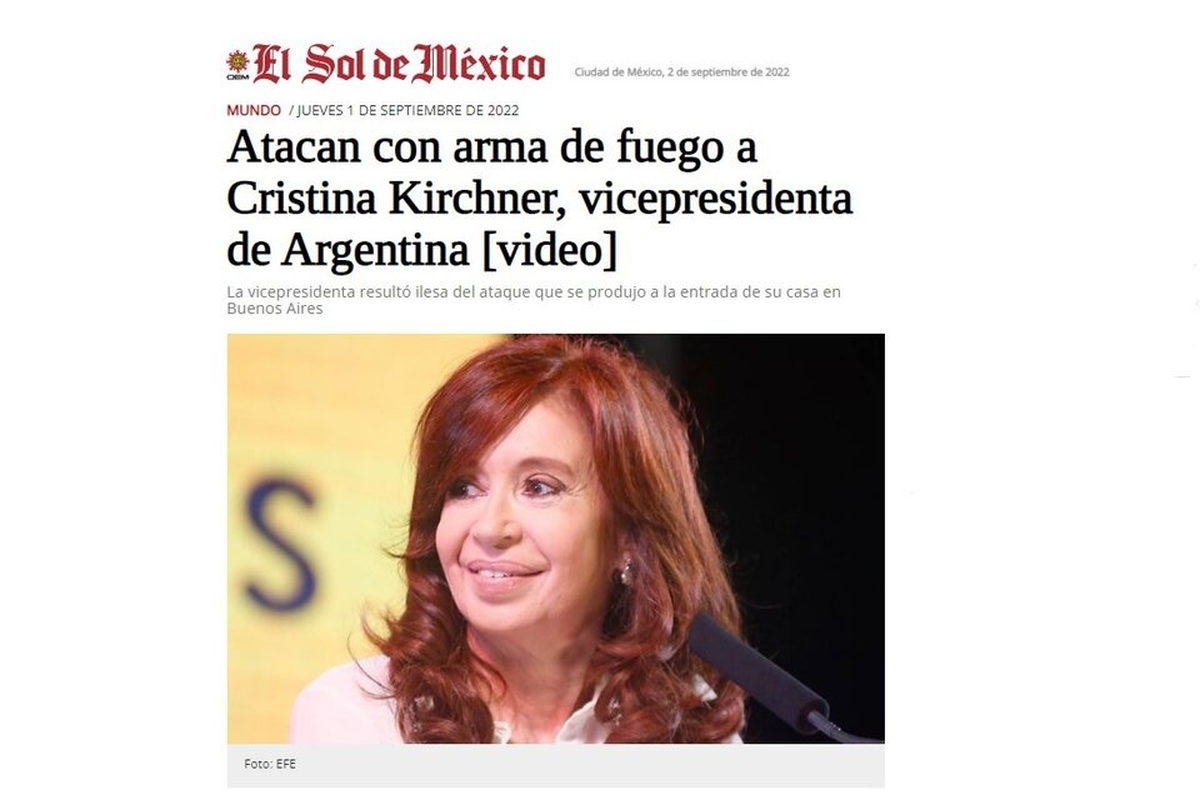 Mientras que, El Sol de México aborda el tema con el titular "Atacan con arma de fuego a Cristina Kirchner, vicepresidenta de Argentina", en donde detallan como fueron los hechos, y adjuntaron distintos videos del momento exacto donde André Sabag Montiel gatilla contra la cara de la vicepresidenta.