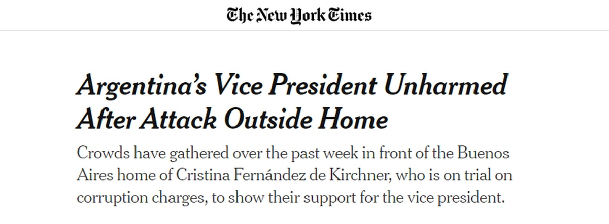 The New York Times también trató la noticia. La nota fue titulada "La vicepresidenta argentina resulta ilesa después del ataque fuera de su casa" e indica: “La Sra. Kirchner, una ex presidenta de izquierda y quizá la líder más prominente de Argentina, es una figura profundamente polarizadora en el país y está siendo juzgada por cargos de corrupción. Sus seguidores se han manifestado frente a su casa en Buenos Aires desde la semana pasada, en ocasiones chocando con la policía”.