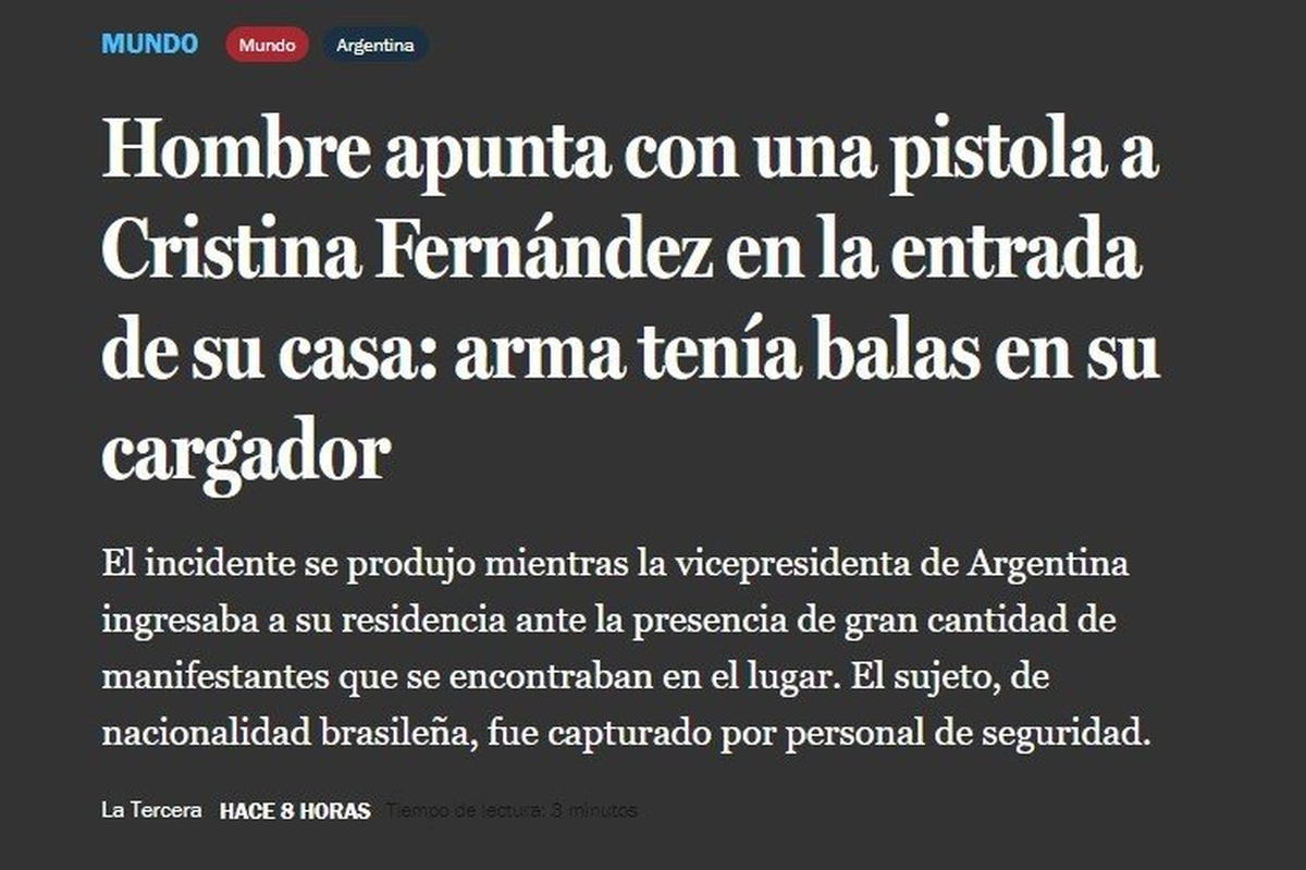 "Hombre apunta con una pistola a Cristina Fernández en la entrada de su casa: arma tenía balas en su cargador", dice el título con el que el medio chileno La Tercera aborda el tema, y El País de España tiene en su portada la noticia con el titular "Detenido un hombre por intentar asesinar con una pistola a Cristina Fernández de Kirchner".