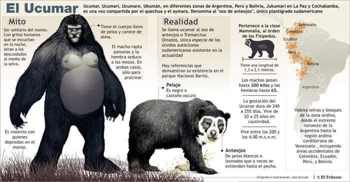 El Ucumar se dice que es ser mitad hombre y mitad oso y que vive en las selvas del Noroeste argentino, también conocidas como las yungas. El Bolivia, se conoce como Jukumari y habita las zonas boscosas del Departamento de Chuquisaca. Ambos están emparentados con mitos peruanos de antigua data.