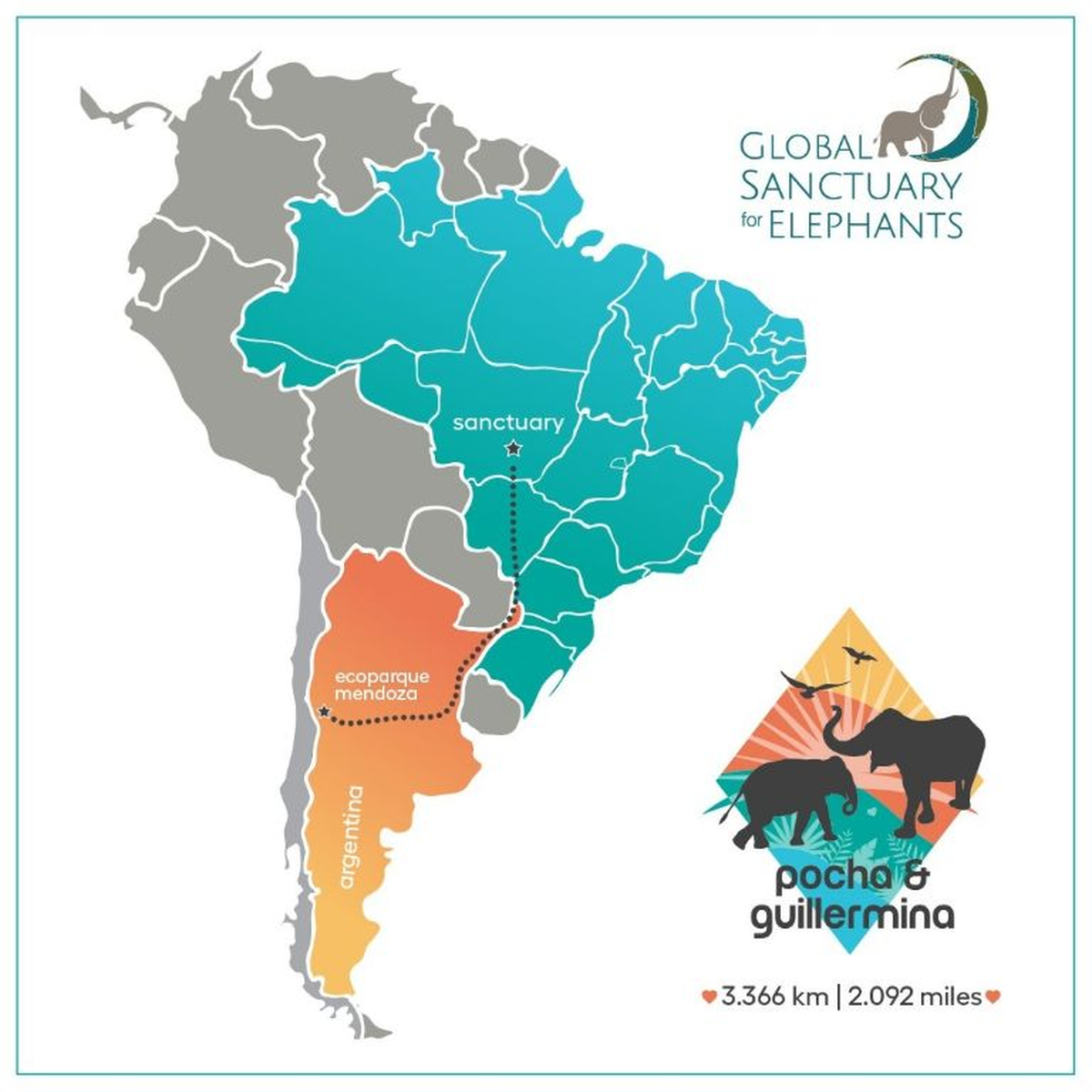 El total del recorrido hasta Mato Grosso fue de 3.600 km. Durante el viaje, Pocha y Guillermina fueron llevadas enfrentadas en distintos contenedores en un mismo camión, siempre mirándose para no estresarse durante el movimiento.