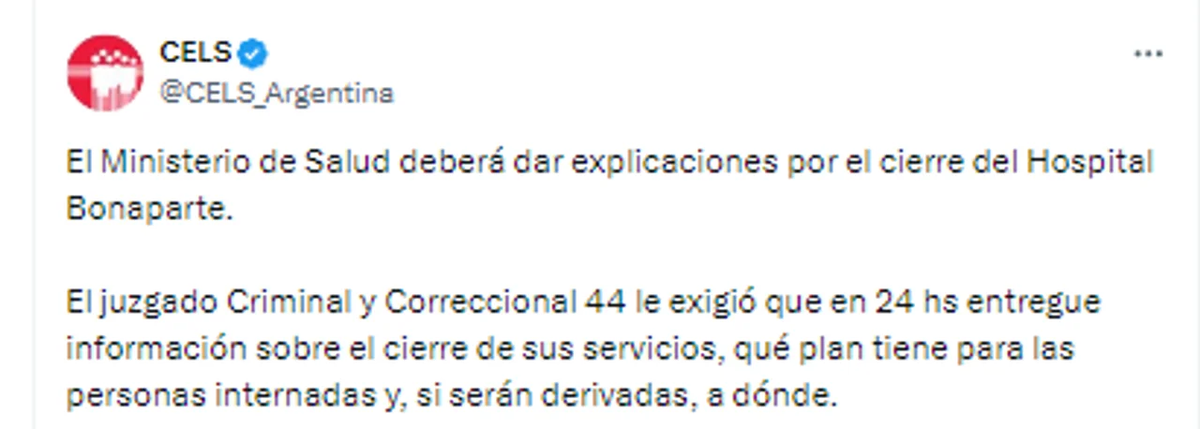 El Juzgado Criminal y Correccional 44 exigió al Ministerio de Salud que, en un plazo de 24 horas, presente información detallada sobre el cierre de los servicios del Hospital Nacional de Salud Mental Lic. Laura Bonaparte. La Justicia busca respuestas claras sobre el futuro de los pacientes internados y si estos serán derivados a otros centros, especificando a cuáles.