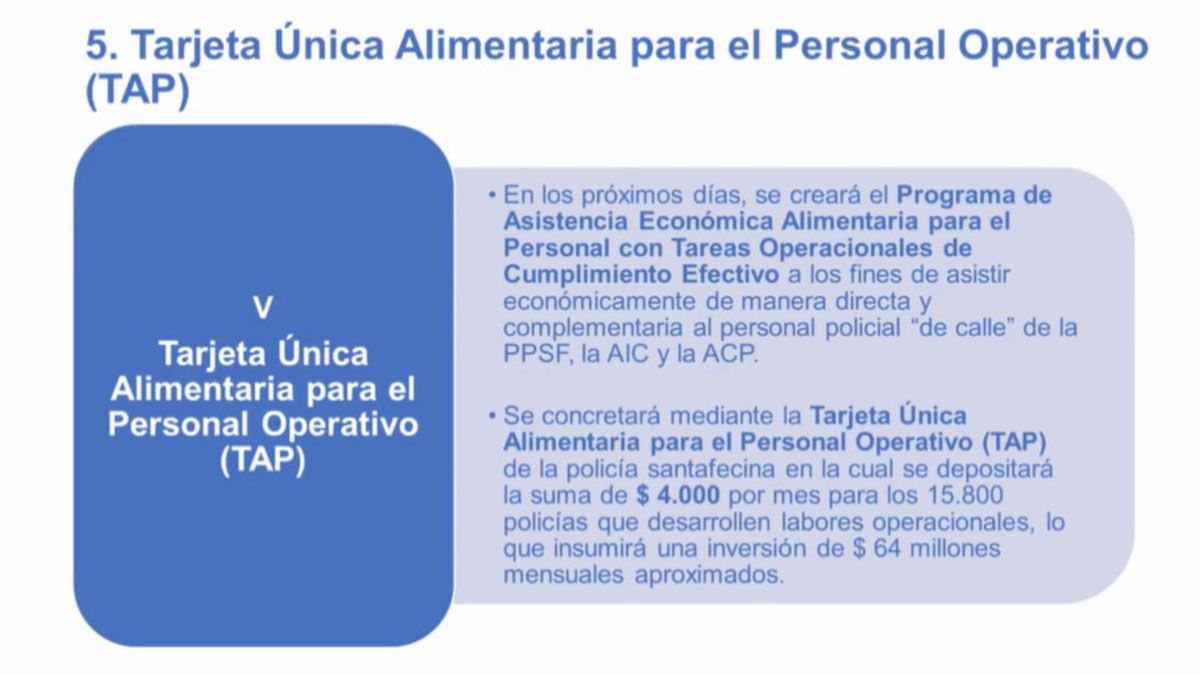 Además, se les otorgará una tarjeta única alimentaria para el personal operativo con 4 mil pesos mensuales "para que cada policía pueda utilizarla en comer en los lugares que pueda dentro del marco de la prestación de servicios". Son 15.800 los policías que recibirán este beneficio.