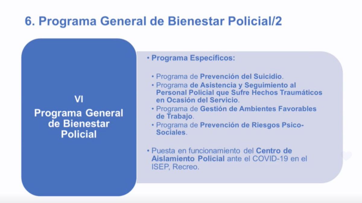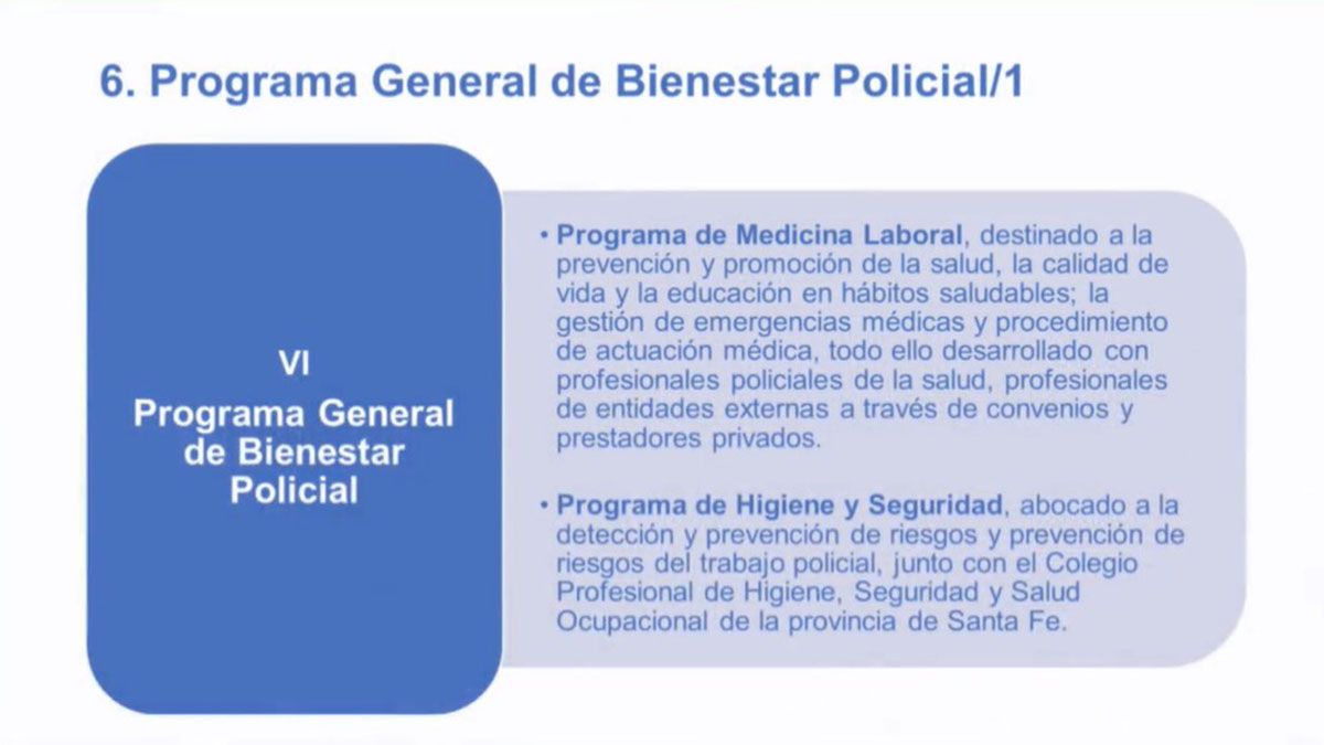 Luego de los anuncios económicos, Sain informó además la elaboración de un Programa General de Bienestar Policial con varios ejes principales: la Medicina Laboral, Higiene y Seguridad, Prevención del suicidio, Asistencia y Seguimiento del personal policial que sufre hechos traumáticos en ocasión de servicio, Gestión de Ambientes Favorables de Trabajo y Prevención de Riesgo Psicosocial.