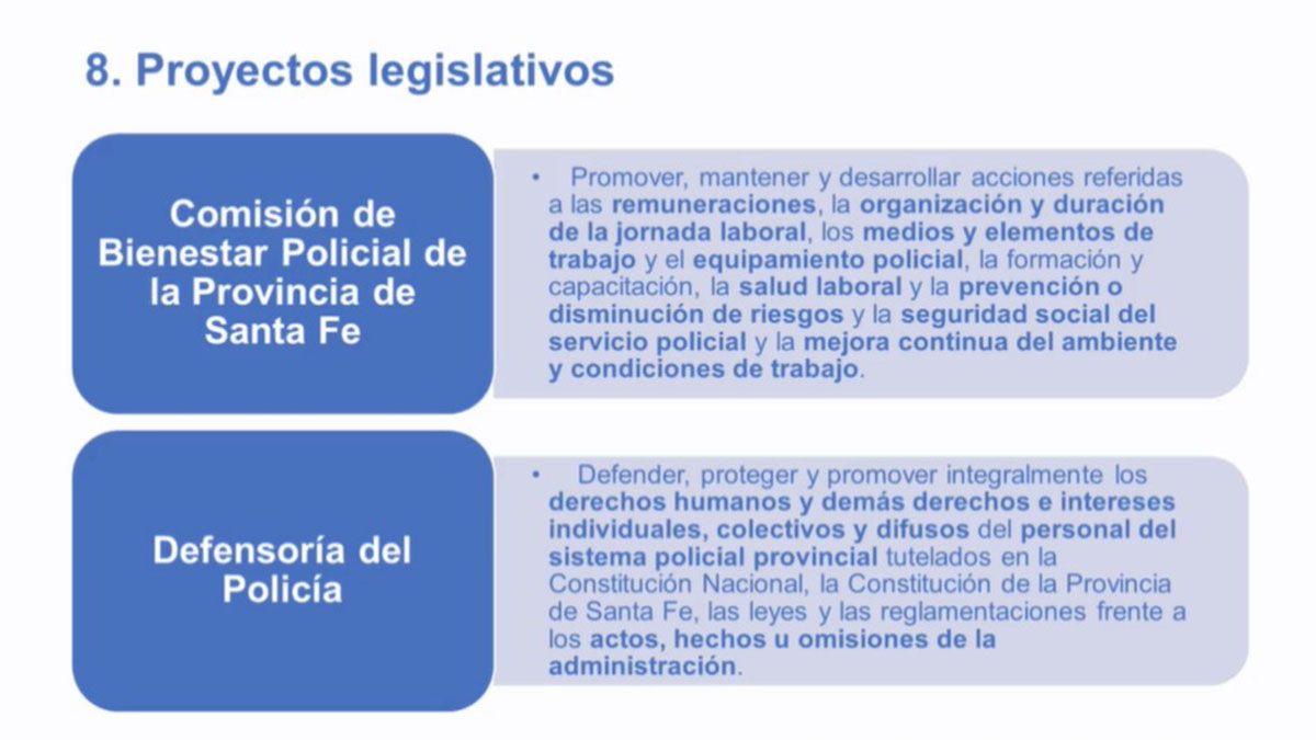 A su vez, anunció el envío de un proyecto al recinto legislativo para crear una Comisión de Bienestar Policial de la Provincia de Santa Fe "para atender todos los aspectos de manera institucional con representantes de los trabajadores, el Ministerio de Seguridad, el Gobierno, que funciones como una paritaria institucional", y otro para la implementación de una Defensoría del Policía, "para defender, proteger y promover los derechos humanos y del personal del sistema policial provincial".