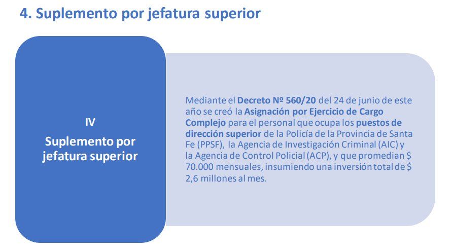En ese marco anunció un "suplemento por tareas operacionales" de 7.000 pesos mensuales para el personal de calle y bomberos que no estén recibiendo otro tipo de suplemento. Esta medida abarca a 10.500 policías, aproximadamente la mitad de la dotación del personal policial de la provincia de Santa Fe.