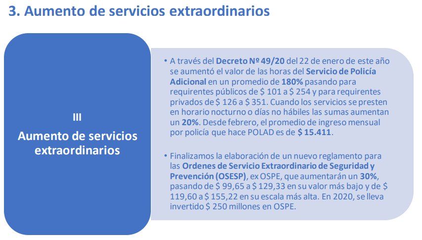 Estas medidas se suman hoy a la asignación especial de 12.000 pesos mensuales aprobada mediante el decreto Nº 931/20 del 31 de agosto para dos servicios específicos: la PAT y Seguridad Rural, " dos servicios muy específicos, muy amplios, muy diferentes del personal de calle, tienen que cubrir distancias muy importantes. Son servicios centrales y requieren un desempeño forzoso por parte del personal policial, por ende comenzamos por ellos y continuamos por lo anunciado hoy que próximamente se traducirá en un decreto", explicó Sain.