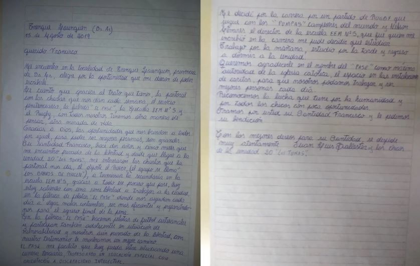 Uno de los internos le envió una carta al papa Francisco, contándole sobre el valor del proyecto