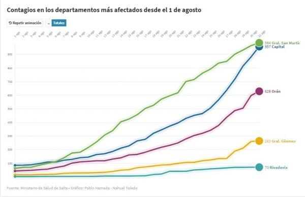 La curva de contagios creció exponencialmente en Salta durante agosto. Solo en ese mes, el sistema de salud registró el 92% de los casos totales contabilizados desde marzo. De acuerdo con lo informado por el Gobierno provincial, en los departamentos Capital, San Martín y Orán hay transmisión comunitaria de COVID-19. De hecho estas tres zonas de la provincia son las que concentran la mayor cantidad de los contagios registrados.
