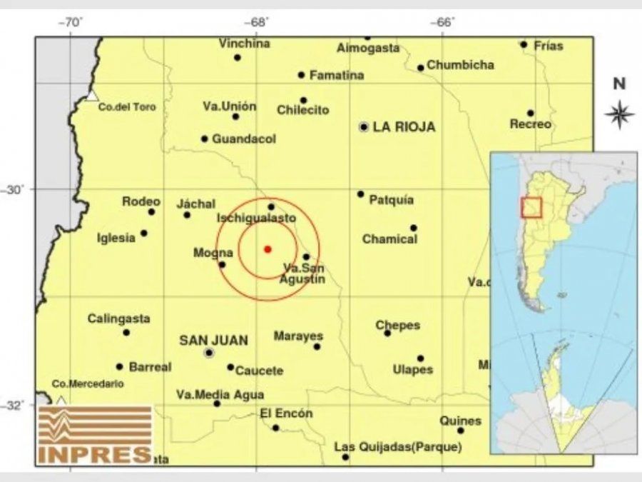 El epicentro fue a 123 kilómetros al noreste de la capital cuyana, 160 kilómetros al sudoeste de La Rioja y 42 kilómetros al oeste del la ciudad sanjuanina de Villa San Agustín.