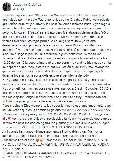 Una de las hijas se despidió de su madre a través de la red social Facebook: "Mi mamá fue apuñalada por mi propio padre conocido como Ordoñez Pablo, esta relación que tenían era muy fuerte y los policías jamás hicieron nada”.