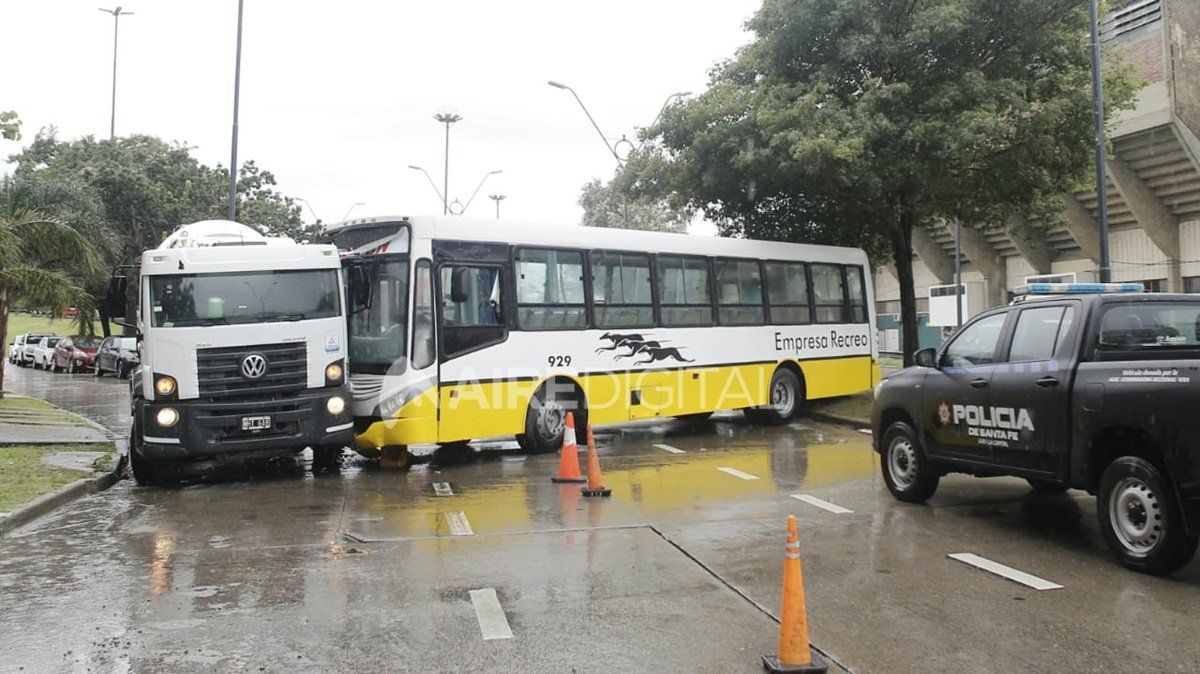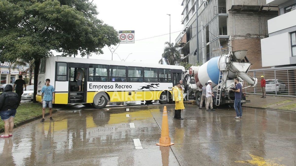 Un impactante choque ocurrió este miércoles al mediodía en avenida Alem, a la bajada del viaducto Oroño, cuando un colectivo embistió a un camión mezclador. La mala maniobra de un automovilista y el piso mojado por la lluvia habrían sido determinantes en el incidente. Además, la circulación estaba reducida en el lugar por la presencia de camiones de una obra en construcción. Precisamente, uno de esos vehículos fue el impactado por el ómnibus.