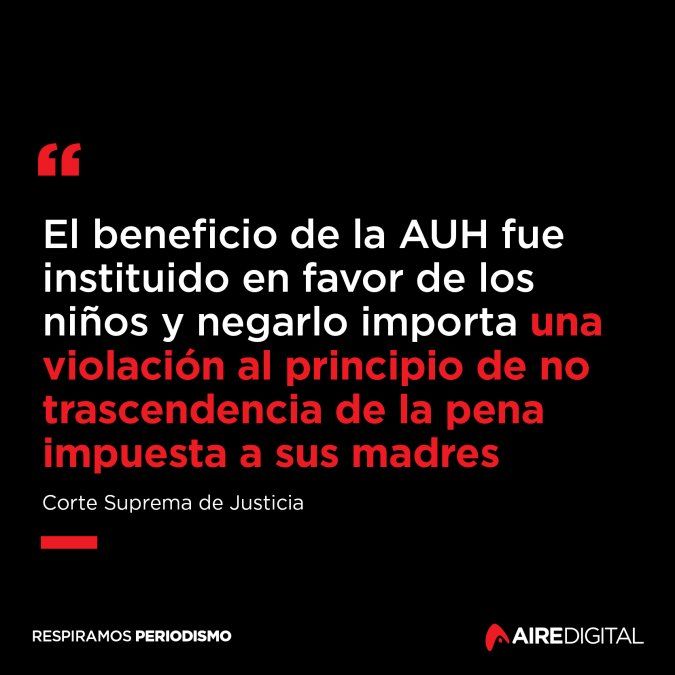 La Corte también hizo referencia en su fallo a la situación de “violencia institucional” a la que alude la Ley de Protección Integral a las Mujeres y su reglamentación en concordancia con las normas internacionales en esta materia, por cuanto “la condición de mujer privada de libertad no puede ser valorada para la denegación o pérdida de planes sociales, subsidios, servicios o cualquier otro beneficio acordado o al que tenga derecho a acceder”.