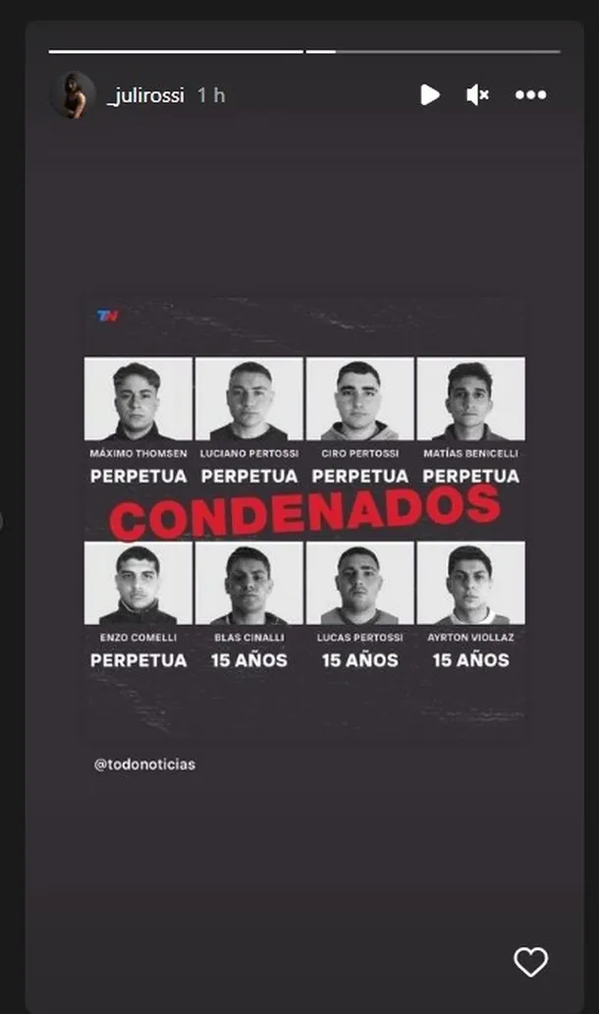 Julieta Rossi, novia de Fernando Báez Sosa reaccionó al respecto en sus redes sociales. "CONDENADOS", dice la placa de un canal de televisión que compartió la joven.