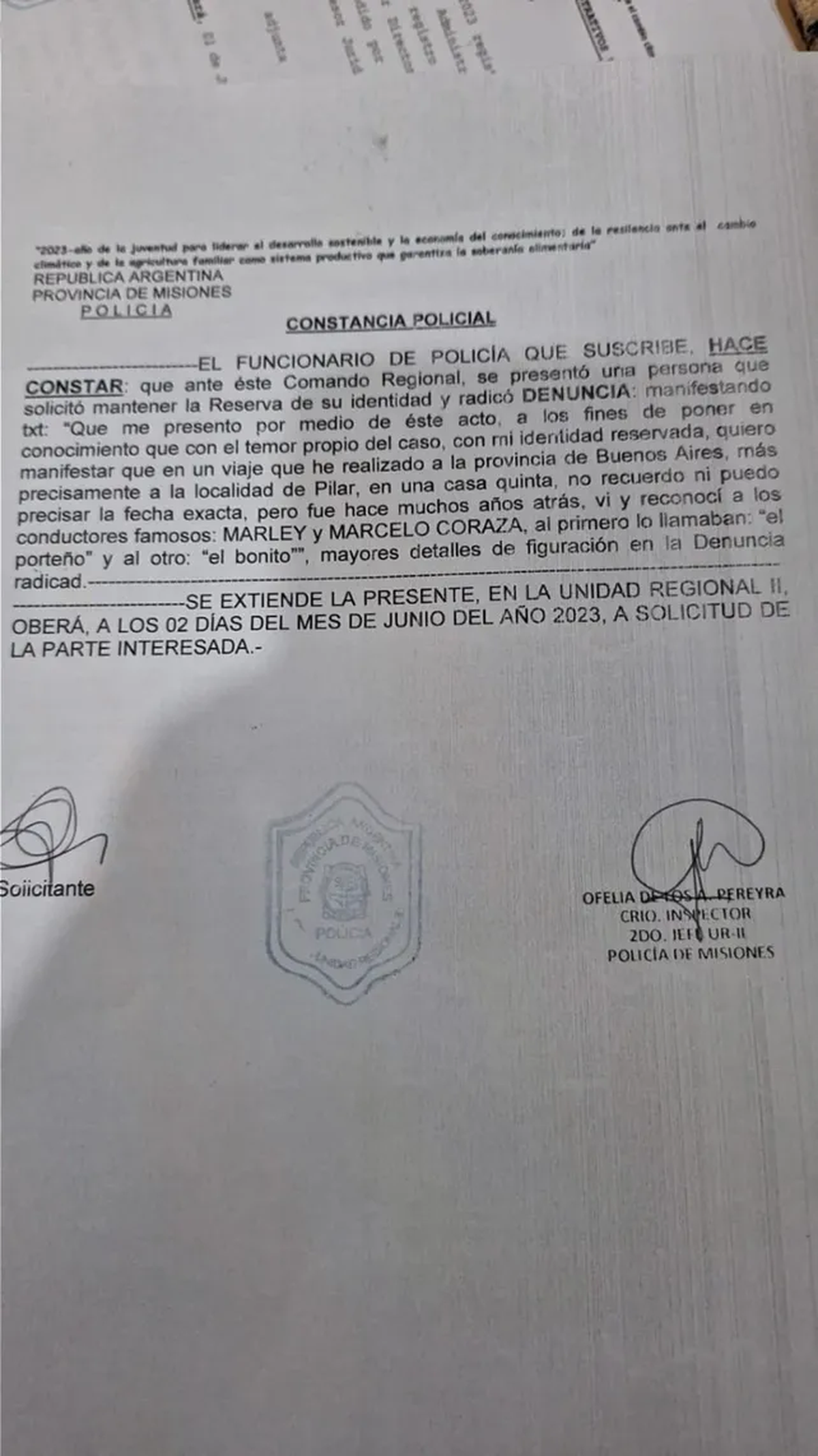 Ramírez mencionó que el denunciante está “profundamente conmocionado y angustiado por lo que tuvo que soportar todo este tiempo”. “Quiero comentar que durante un viaje que hice a la provincia de Buenos Aires, específicamente a la localidad de Pilar, en una casa de campo, vi y reconocí a los famosos presentadores: Marley y Marcelo Corazza.