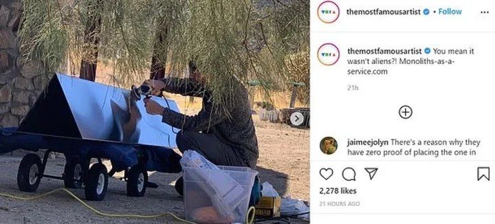 Ubicados en Nuevo México (Estados Unidos), el grupo de "The Most Famous Artist" también mostró imágenes del arte conceptual de los monolitos y el momento de su elaboración. "¿Quieren decir que no fueron 'aliens'?", se preguntaron en su cuenta de Instagram.