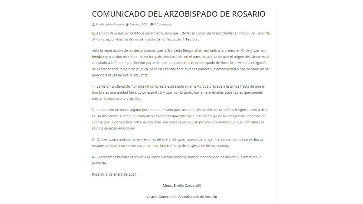 El Arzobispado rosarino emitió el lunes un comunicado firmado por monseñor Emilio Cardarelli, para referirse al tema y manifestó que las expresiones de la Leda Bergonzi acerca del origen del cáncer "son de su exclusiva responsabilidad y no se corresponden con la enseñanza de la Iglesia en dicha materia".
