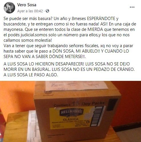 Su abuelo desapareció el 10 de enero de 2019 en el barrio de las 250 Viviendas de la ciudad de General Roca, en Río Negro. Tras hallarse unos restos óseos en un basural, a mediados de agosto pasado el Laboratorio Regional de Genética Forense determinó que pertenecen a Luis Sosa, según informó en ese momento el Ministerio Público Fiscal.