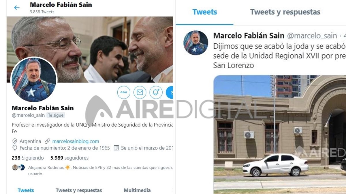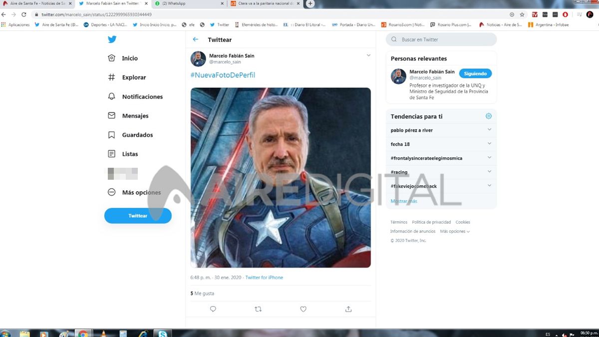 Este jueves por la tarde, el espacio de Sain en Twitter mostraba una nueva foto de perfil, donde se ve un "collage" que muestra al ministro de Seguridad ataviado como Capitán América. Aunque todo apuntaba a un hackeo, fuentes del entorno del ministro confirmaron a Aire de Santa Fe que no lo es. La explicación: la imagen sería un "meme" que habría estado circulando entre miembros de la oposición, y como respuesta —y desafío— a ello Sain habría decidido utilizarla en su cuenta.