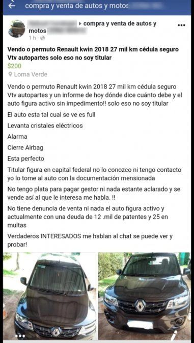 En el posteo, el vendedor también detallaba que contaba con cédula, seguro, verificación técnica vehicular, grabado de autopartes. Pero aclaraba que él no era el titular del rodado, sino que el mismo figuraba en Capital Federal y no lo conocía. “No tiene denuncia de venta ni nada. El auto figura activo y actualmente con una deuda de 12 mil de patentes y 25 mil en multas”, agregaba.