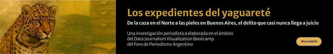 El caso, en tanto, reabrió una pregunta urgente: si matar un yaguareté es un delito, ¿por qué el sistema penal rara vez logra una condena? Para tratar de contestar esta pregunta la siguiente investigación periodística —elaborada en el Data Journalism Visualization Bootcamp del Foro de Periodismo Argentino (FOPEA), con apoyo de la Embajada de Suiza en la Argentina, en la que participó la periodista de AIRE Jésica Oldani— reconstruye los expedientes del yaguareté a partir de un pedido de acceso a la información pública y de múltiples fuentes relacionadas con el tema.