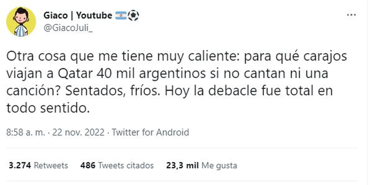 La Selección argentina perdió 2-1 con Arabia Saudita en la primera fecha del Mundial de Qatar 2022 y esto generó un sinfín de polémicas en Twitter. Una de ellas tuvo como protagonistas a los hinchas en Twitter, que cuestionaron a todos aquellos que viajaron al país asiático: la bronca fue porque el aliento en las tribunas no habría sido suficiente.