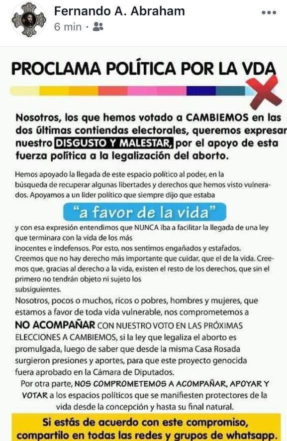 Además, afirma que “los que hemos votado a Cambiemos en las últimas dos contiendas electorales, queremos expresar nuestro disgusto y malestar por el apoyo de esta fuerza política a la legalización del aborto”.