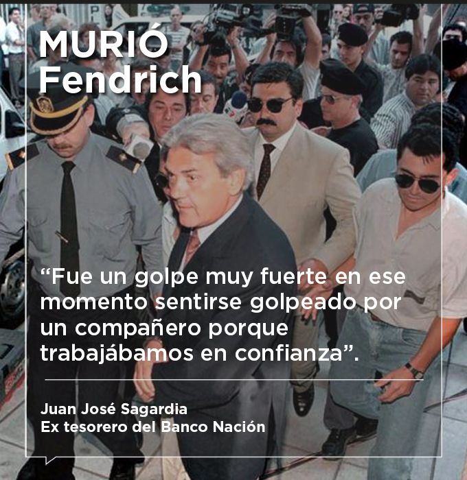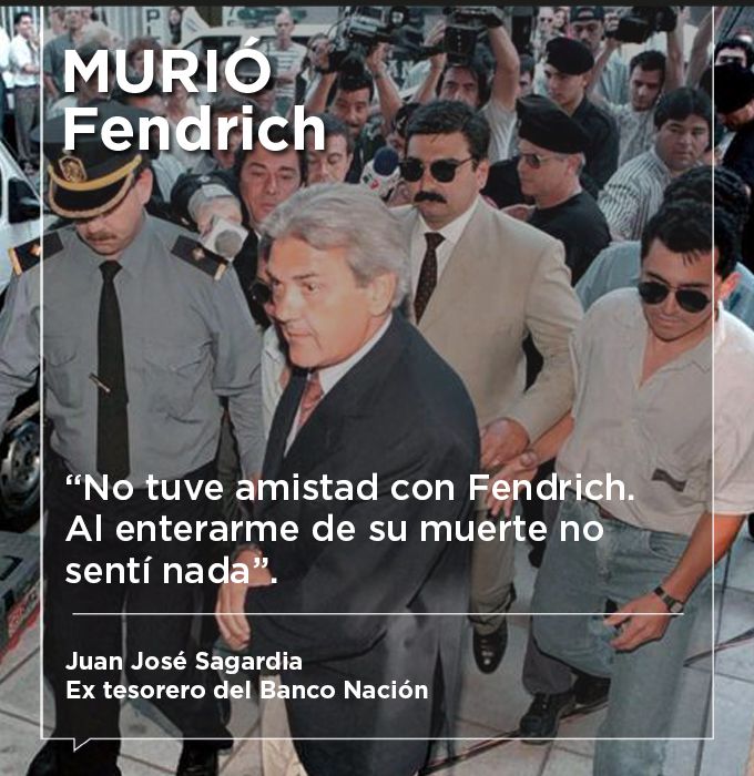 “Lo que hizo Fendrich es un hecho delictivo pero es suyo. Es su conciencia. No soy yo quien lo va a juzgar”, dijo Sagardía, quien era el tesorero que recibió la nota del ladrón. El ex empleado del Banco recordó que con solo 17 años había ingresado a la entidad y a los 50 lo echaron. Su despido del banco estuvo directamente relacionado al robo de Fendrich. “Él insistió en que lo habían secuestrado pero ante la justicia no pudo demostrar como lo habían hecho. Por eso se transformó en excusa. Si él hubiera dicho que robó, no hubiese estado un solo dia en la cárcel. Porque sustrajo el dinero sin violencia”, continuó.