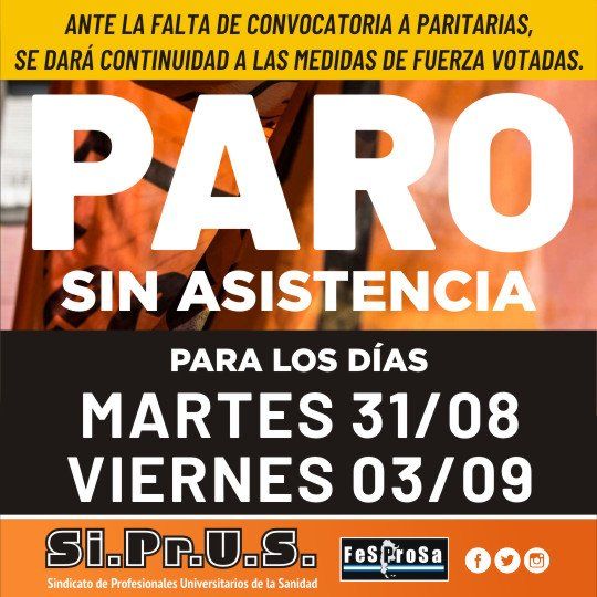 El Sindicato Profesionales Universitarios de la Salud (Siprus) anunció dos días de paro sin asistencia a los lugares de trabajo como medida de fuerza para la semana que viene. El primero se realizará este martes 31 de agosto y el segundo el viernes 3 de septiembre.