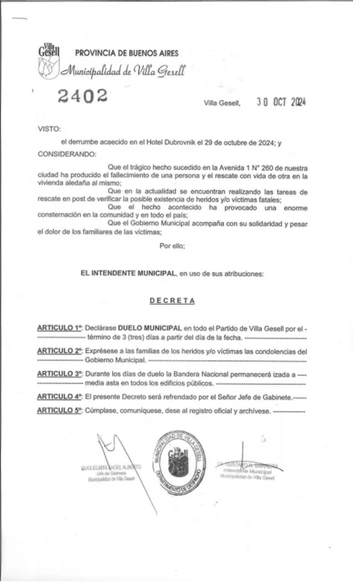 La Municipalidad de Villa Gesell declaró tres días de duelo tras el derrumbe del hotel Dubrovnik, donde hasta el momento dos personas perdieron la vida y una mujer fue rescatada con vida.