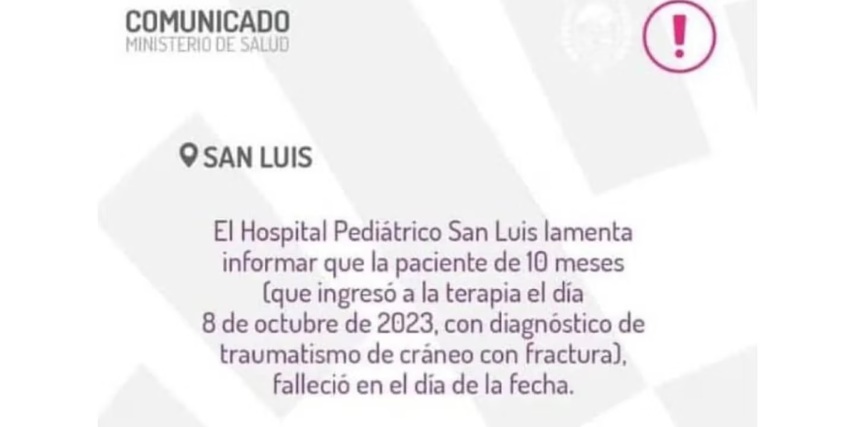 Desde el hospital San Luis, comunicaron el fallecimiento de la bebé de 10 meses que ingresó con fractura de cráneo. La triste noticia se confirmó este domingo, en horas de la tarde.