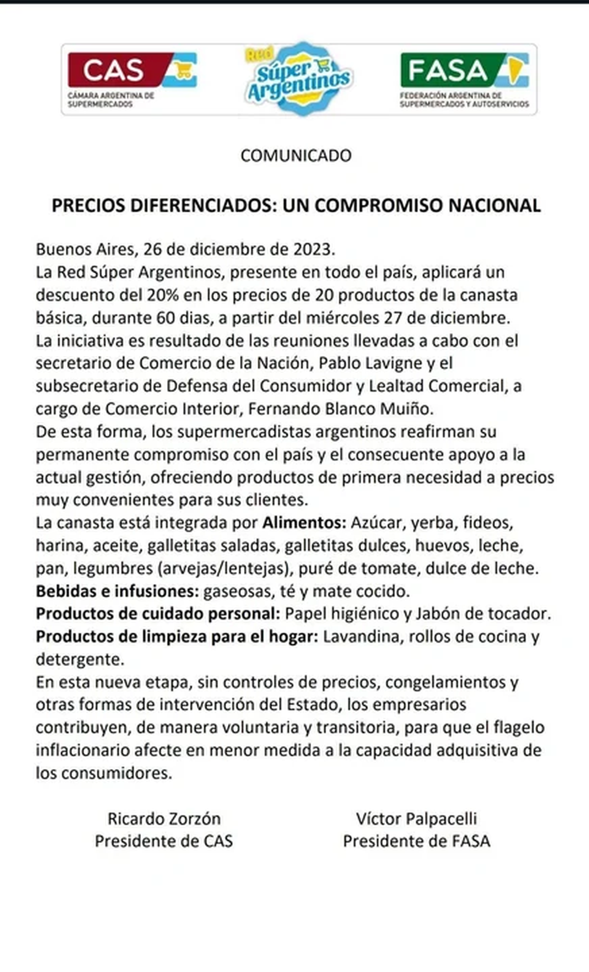 El grupo de supermercados asociados en “Red Super Argentinos” anunció que se aplicará un descuento del 20% en los precios de 20 productos de la canasta básica por 60 días.