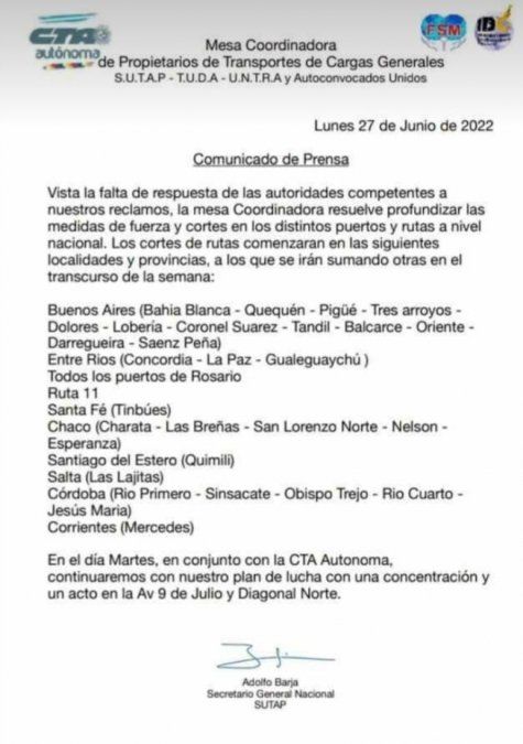 El comunicado cierra con el anuncio de una movilización en la Ciudad Autónoma de Buenos Aires: "El día martes, en conjunto con la CTA Autónoma, continuaremos con nuestro plan de lucha con una concentración y un acto en la Avenida 9 de Julio y Diagonal Norte", indica el texto, que lleva la firma de Adolfo Barja, secretario general del Sindicato Único de Trabajadores de Administraciones Portuarias (Sutap), entidad que integra la mencionada Mesa Coordinadora.