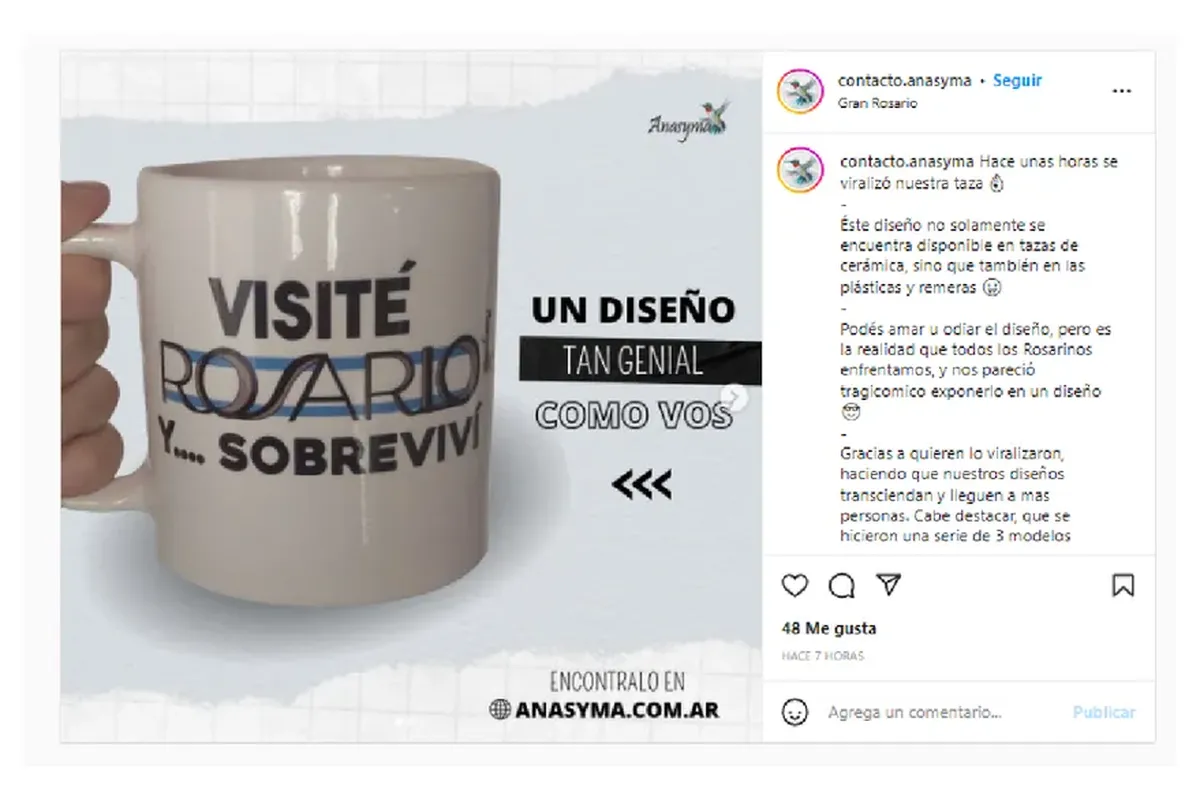 Desde el local que vende la taza, justificaron el souvenir tragicómico y escribieron en Instagram: “Podés amar u odiar el diseño, pero es la realidad que todos los rosarinos enfrentamos y nos pareció tragicómico exponerlo en un diseño”.