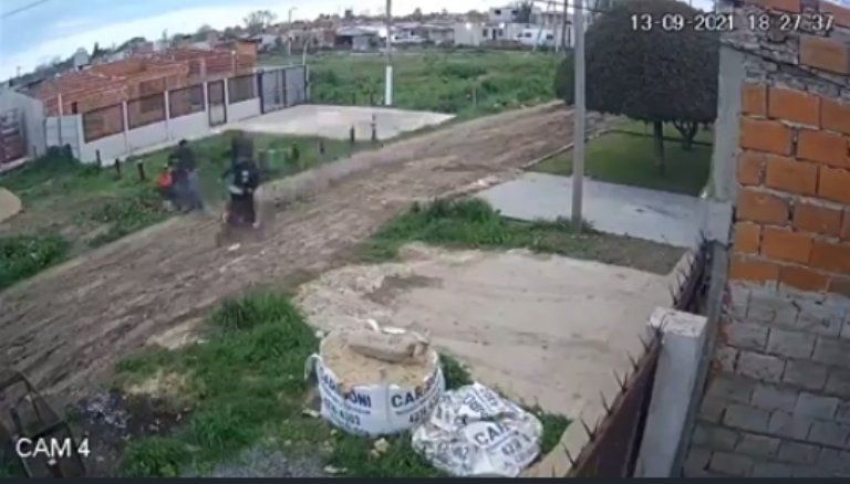 En las imágenes se ve al hombre caminando junto a su hijo cuando aparecen los dos delincuentes, quienes lo amenazan para robarle y luego emprenden la huida. La víctima intenta proteger a su hijo y luego comienza a lanzarle piedras a los motochorros, quienes huyen a toda velocidad.