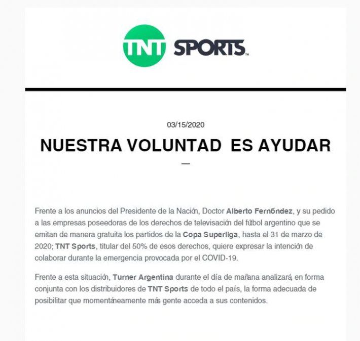 Frente a los anuncios del Presidente de la Nación, Doctor Alberto Fernández, y su pedido a las empresas poseedoras de los derechos de televisación del fútbol argentino que se emitan de manera gratuita los partidos de la Copa Superliga, hasta el 31 de marzo de 2020; TNT Sports, titular del 50% de esos derechos, quiere expresar la intención de colaborar durante la emergencia provocada por el COVID-19.